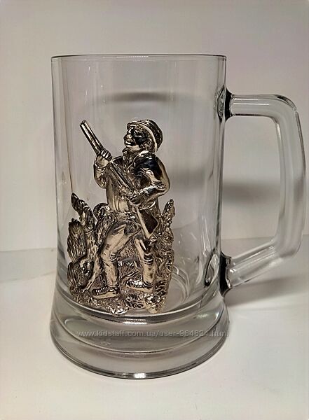 Мисливський пивний бокал з барельєфом "Мисливець з собакою" в подарунковій коробці.Бокал виготовлений із міцного скла оздоблений олов´яним барельєфом.