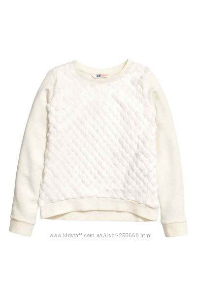 Свитшет из мягкого плотного трикотажа с эффектом меховой отделки. Модель слегка удлиненная, сзади чуть длиннее. Низ и манжеты на резинке. Состав:70%хлопок, 30%-полиестер. H&M.