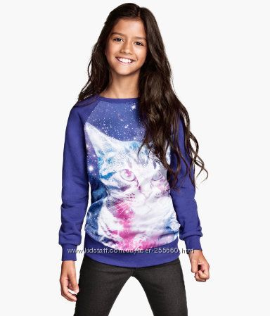 Яркий модный свитшет для девочки с эффектным принтом в виде кошки в сине-фиолетовых цветах. H&M.