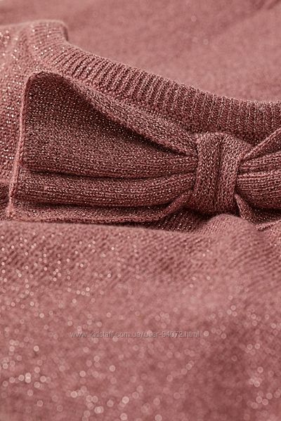 Платье тонкой вязки из мягкой пряжи из смесового хлопка с добавлением блестящих нитей. Модель с трикотажной резинкой по горловине и декоративным бантом сверху. Короткий рукав.