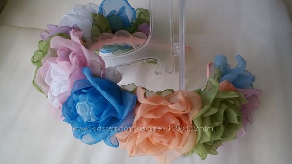 Обруч с разноцветными розами из шифона и атласных лент. Все листики и лепесточки выполнены только вручную. Подходит как взрослым так и детям размер универсальный. Очень красивый аксессуар, который способен превратить повседневный наряд в праздничной.Возможно изготовление в другом цвете)