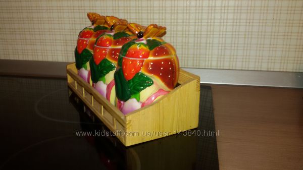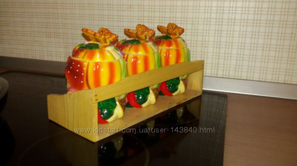 Набор состоит из трёх одинаковых банок с крышками.Деревянная подставка.