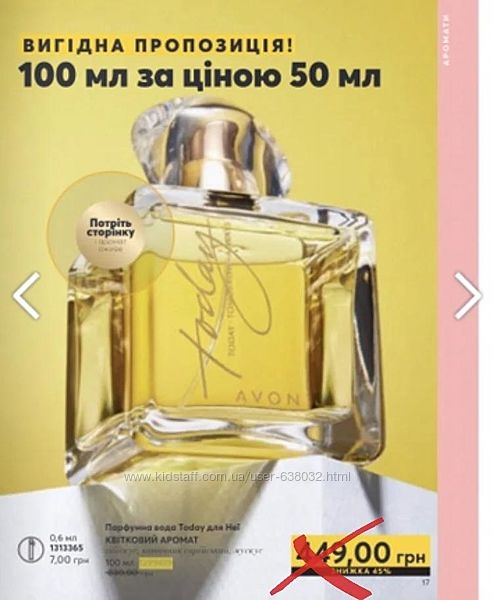 Базові ноти: сандал, вірджинський кедр, шовковий мускусАромат-бестселер, більш ніж 10 років лідер продажу*. Цей аромат відкриває легендарну трилогію кохання Today Tomorrow Always від Avon, підкорюючи променистими квітковими нотами.Творець аромату – Олів’є Кресп, один із найталановитіших парфумерів зі світовим ім’ям. За 20 років роботи у світі парфумерного мистецтва він став автором більш ніж 70 ароматів, які відомі в усьому світі. Створюючи аромат Today, він надихався чарівним і пристрасним втіленням у життя аромату, здатного нести в собі відчуття безкінечності такого почуття, як кохання.