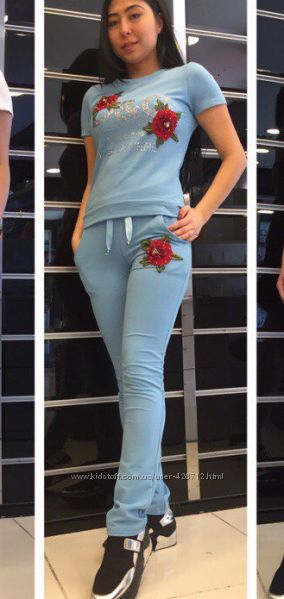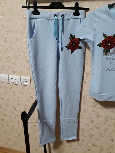 Турция Шикарный летний костюм D&G брендовая турция от Rich Glam украшен стразами и вышевкой цвет голубой С и пудра размеры в наличии С Хлопок