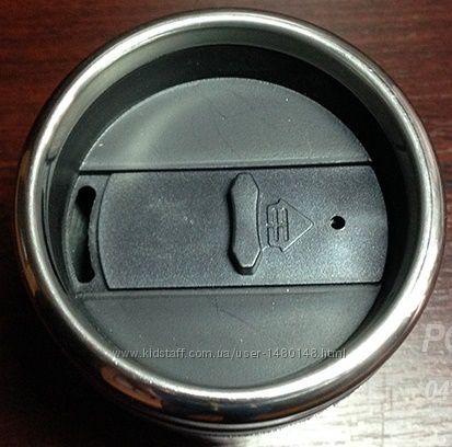 Пластиковая крышка с металлической окантовкой имеет силиконовое, кольцевое, уплотнение и специальный удобный клапан для питья. Это предотвращает случайное выливание содержимого. Цвет пластика крышки - черный.