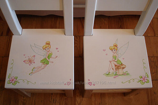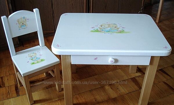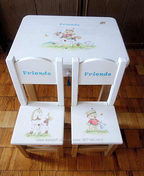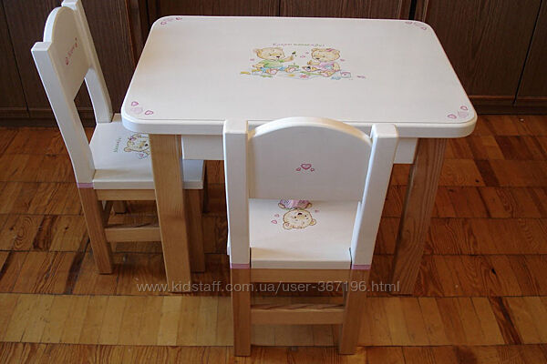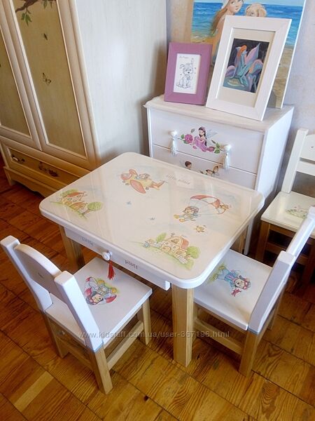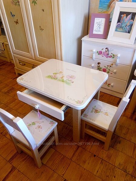 Красивый комплект детский мебели из массива ясеня! Новый. Ручная роспись. Один экземпляр.Столик с выдвижным ящичком и двумя стульчиками. Белого цвета, с ручной авторской росписью от художника-иллюстратора.