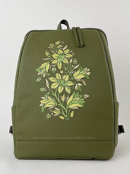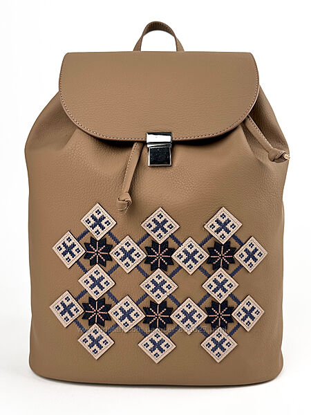 Зовні рюкзак має дві бічні кишені на магнітах, на задній стінці кишеню на блискавці для дрібних речей і вшита тасьма з карабіном для ключів. Плечові ремені зроблені з ущільненням, що надає комфорту при носінні рюкзака. Рюкзак прикрашений вишивкою та аплікацією у патріотичному стилі, виготовлений із високоякісної штучної шкіри.