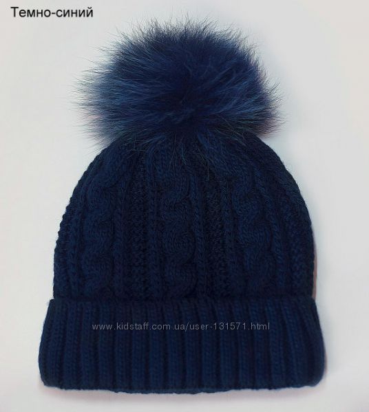 Женская зимняя шапка, а также для девочек от 7 лет. Полностью на флисе, с отворотом.Украшена вязаными косами и бубоном из натурального песца.