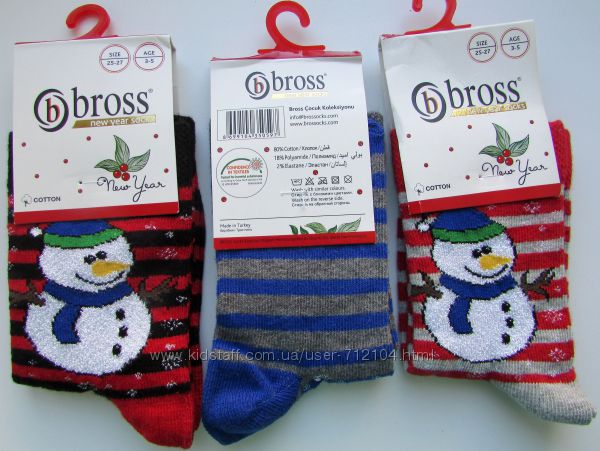 Детские демисезонные новогодние носки Bross разных размеров. Актуальное наличие на фото. Носки полномерные, идут размер в размер. Не садятся после стирки, не кошлатятся, носятся отлично. Состав: 80%-хлопок, 18%-полиамид, 2%-эластан. Производитель: Турция.