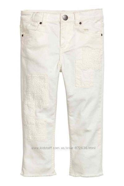 Модные укороченные джинсы для девочек от известного бренда H&M. Стильные латки из прошвы. Пять карманов. Необработанный низ!! Застегиваются на молнию и кнопку с фирменным логотипом. Талия регулируется внутренней резинкой. Отличное качество!! Состав: 98% хлопок, 2% эластан.Размеры и цвета в наличии: