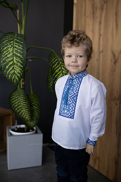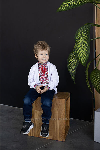 Дитяча вишита сорочка виконана на сорочковій тканині, прикрашена традиційною вишивкою нитками синього або червоно- чорного кольору . Вдале поєднання кольорів створює унікальний вигляд, завдяки чому вишиванка має багатий та святковий вигляд.Виробник: Україна.