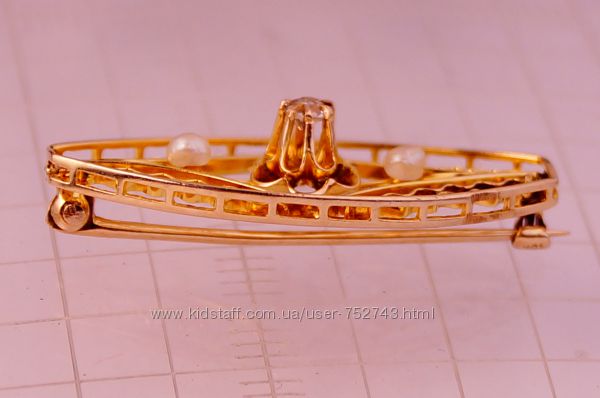 Старинная золотая брошь 420 пробы 10 карат. Европа. Вес1,57грамм. Бриллиант старинной огранки диаметр 2,4-2,55 мм. в диаметре, чистый, белый. Жемчуг натуральный природный. Размер броши 28х12мм.Другие объявления продавца