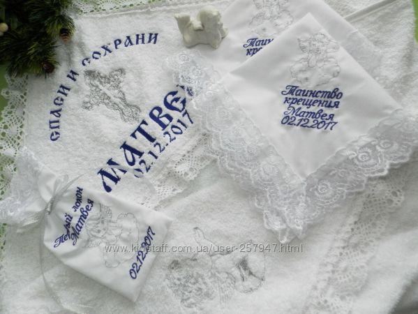 В комплект возможно сделать наряд, мешочек для первого локона, и платочки для крестных)