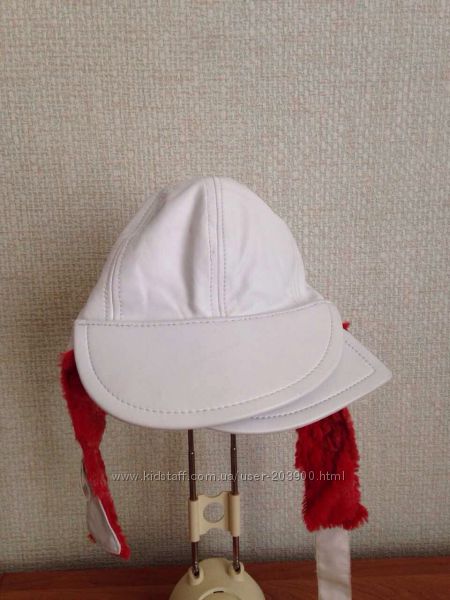 Детская шапочка оригинального фасона. Верх белая искусственная кожа магкая, элластичная. Подбита красным мехом, завязки, два козырька. Непробиваемая для ветра, интересный дизайн. Размер XS, наш 53-55. Новая, но без бирки. Покупалась в США. Оплата на карту. Доставка укрпочтой и новой почтой.