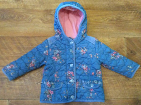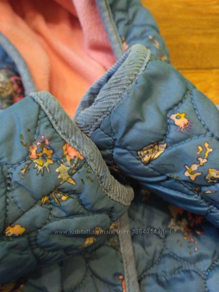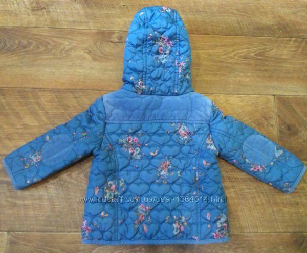 Модная курточка для вашей малышки от известного качественного бренда. По бирке 12-18 месяцев, мы носили с 10 месяцев и до года и 6 месяцев. Всё зависит от комплекции ребёнка. Замеры: длина от капюшона по спинке -35 см. Длина рукава от плеча- 27,5 см, рукав внутренний-20 см. Ширина под ручками-32 см. Основной цвет -синий, принт -нежно-розовые цветы. Спереди два кармашка. Застегивается на молнию и кнопки. Подходит на холодную осень, теплую весну. Молния и кнопочки рабочие. Небольшие потертости есть по плечам, видно на фото. На все вопросы отвечу.