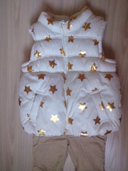 Все вещи в отл.состоянии. Фото 2-5: OLD NAVY жилет теплый белый с золотыми звездами,размер 4. Замеры: по спинке без воротника 35 см,воротничок 3.5 см.,ширина под рукавами 32 см, ширина в самом низу жилетки 35 см.Застегивается на молнию,есть кармашки.Цена 170 грн.