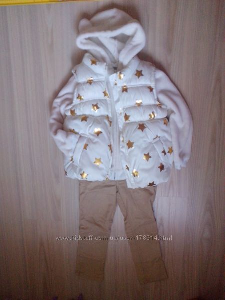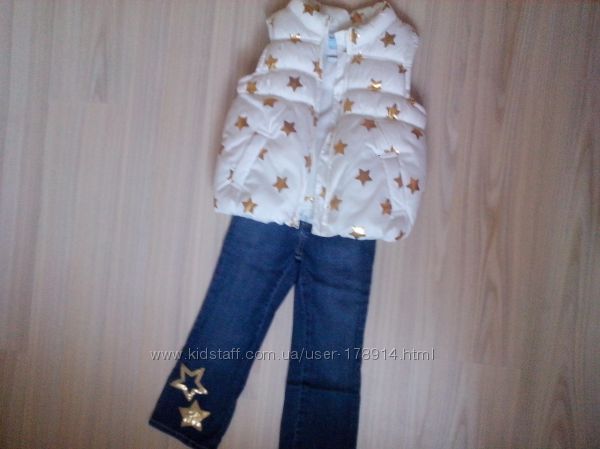 Все вещи в идеальном состоянии. Фото 2-3: реглан GYMBOREE размер 4 ,но бренд большемерит, ориентируйтесь на замеры. Замеры: длина по спинке 40 см,рукав от плеча 35 см. Ширина 29 см. Украшен блестящей звездочкой и стразами.Н а рукавах люрексовая нить.Состояние очень хорошее,без пятен,дыр. Носили не часто.Цена 120 грн. Фото 4-5: джинсы со звездочкой GYMBOREE ,размер 4.Замеры: общая длина 57 см, шаговый 43 см. ОБ 27 см, в поясе есть утяжка. Звездочка расшита пайетками. Сост.отличное.Цена 140 грн. Фото 6-7: брючки скинни GYMBOREE с золотистым напылением.Размер 4. .Отл.состояние. Замеры : общая длина 56 см, шаговый 42 см.ОБ 28 см, ОТ 25 см, в поясе есть утяжка. Цена 130 грн. Фото 8-10 : жилет со звездами OLD NAVY размер 4. Не тонкий.Замеры: по спинке без воротника 35 см,воротничок 3.5 см.,ширина под рукавами 32 см, ширина в самом низу жилетки 35 см.Застегивается на молнию,есть кармашки.Цена 170 грн. Отл.сост. В другом моем объявлении есть еще вещи из коллекции Звезды. Здесь не вместились.