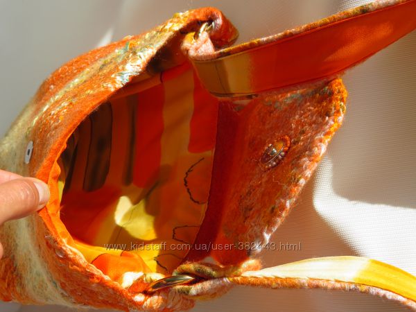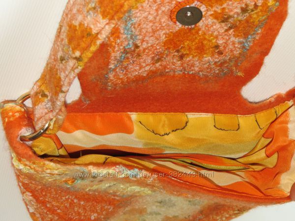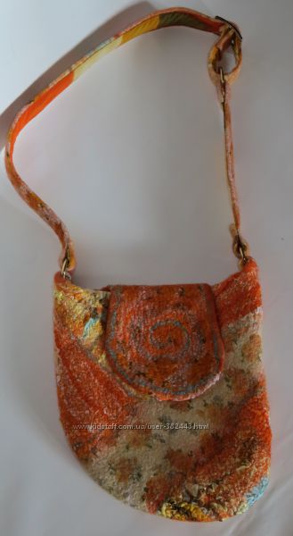 Сумочка женская валяная оригинальной формы, ручная работа. Небольшая, но очень вместительная около 27*30 см. Сваляна из натуральной шерсти. В декоре использованы волокна вискозы и фрагменты ткани. Войлочная сумка плотная и отлично держит форму, закрывается на магнитный замочек. Внутри подкладка с карманом на молнии. Ручка валяная, внутри усилена такой же тканью, как и подкладка. Длина ручки регулируется от 71 до 105 см, что позволяет носить сумку как на плече, так и наперевес через плечо, оставляя руки полностью свободными.Сделана в единственном экземпляре.