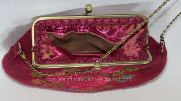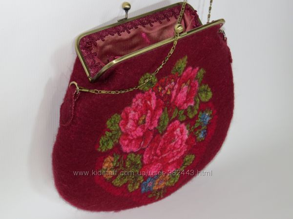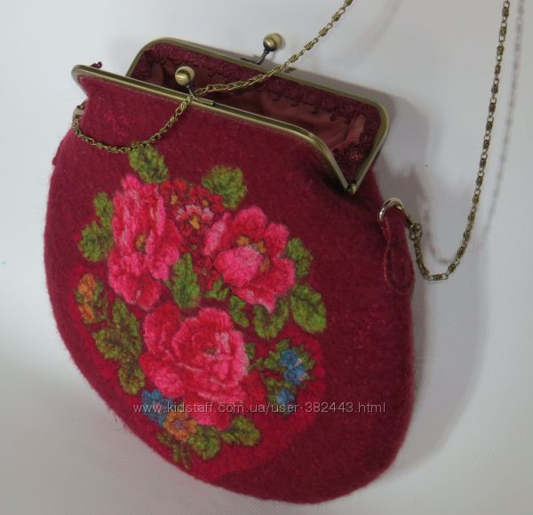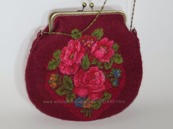 Сумочка валяная цвета Бордо. Небольшая, но очень вместительная около 27*30 см. Сваляна из натуральной шерсти. В декоре использован фрагмент Павлопосадского платочка, волокна вискозы и крапивы.Войлочная сумка плотная и отлично держит форму, закрывается на рамочный замок(фермуар)-18см. Внутри подкладка с кармашком. Ручка-цепочка(120см).