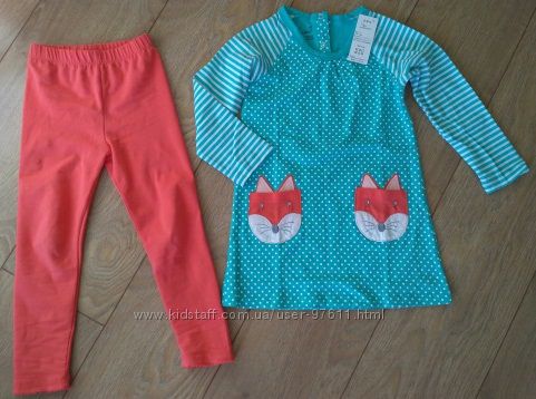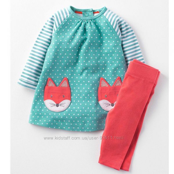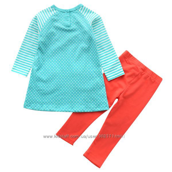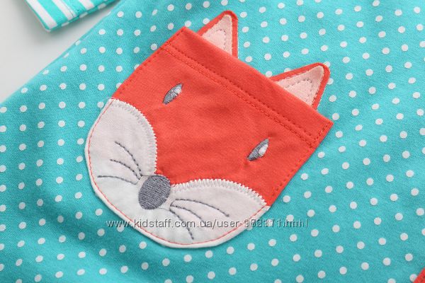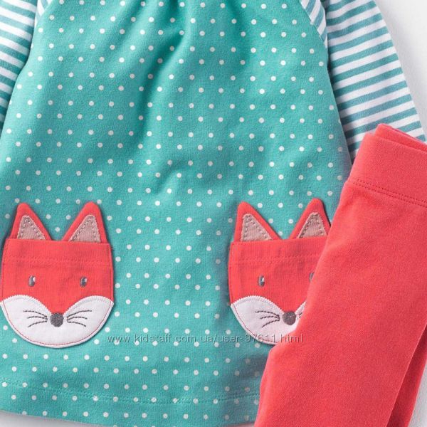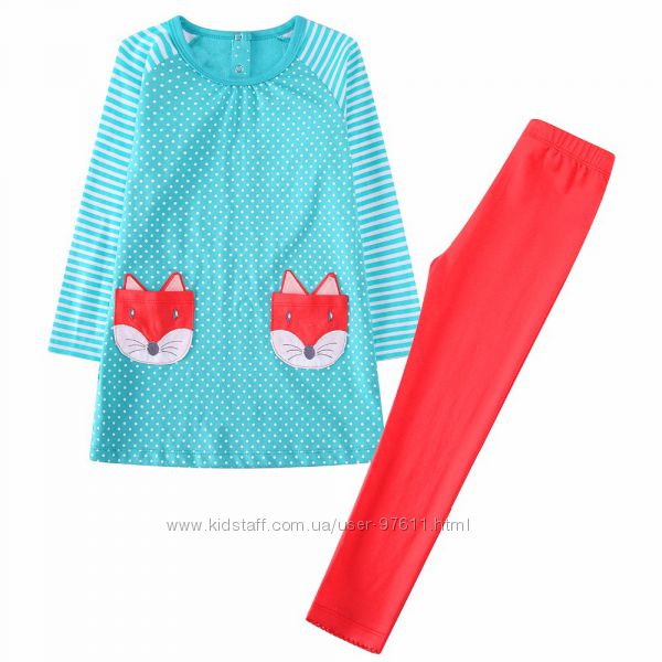 Комплект складаєтся з кофтини-туніки та легінсів. Туніка - трапеція бірюзового кольору.Спереду на кофті аплікація-кармани Лисички в тон легінсів.