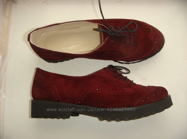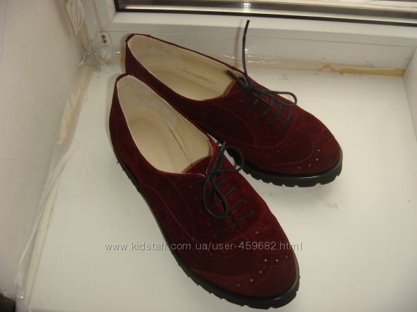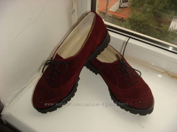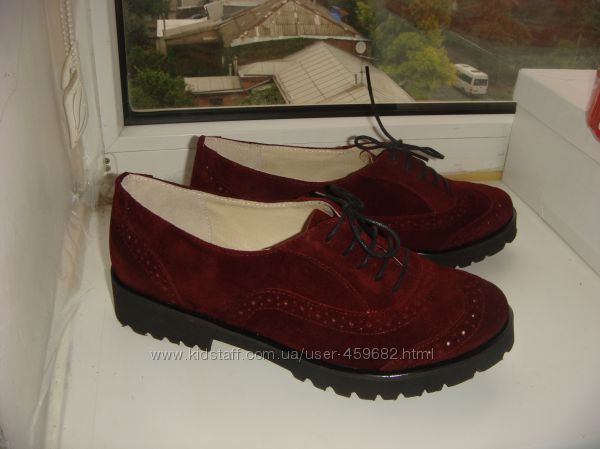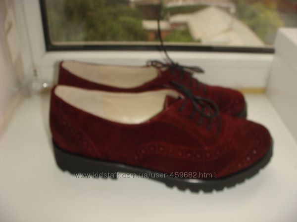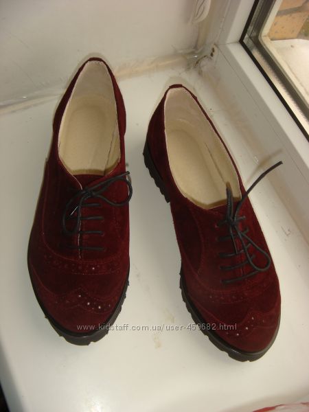 Новые , очень легкие туфельки-оксфорды из натуральной замши темно-бордового цвета (марсала) .Размер 36 - длина стельки от края и до края 23,7 см . Подходят на ножку 23,5 см средней полноты.