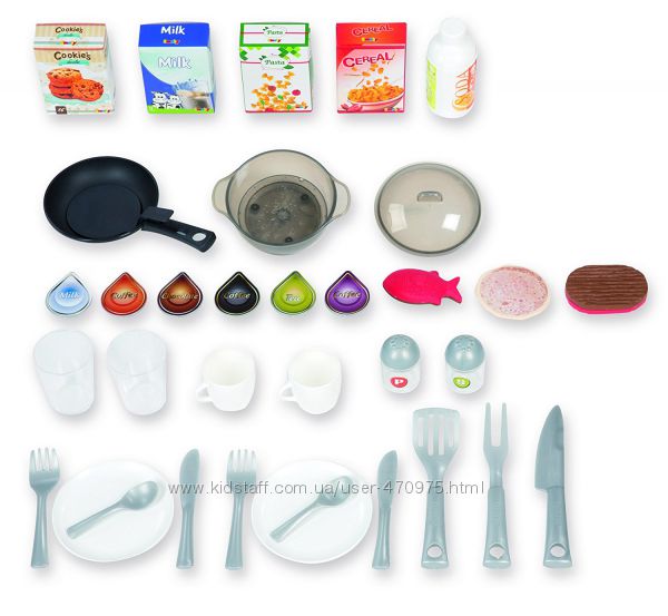 Характеристики: Интерактивная плита (звуки кипения и варки), духовой шкаф (дверца открывается), посудомоечная машина (дверца открывается), полочка (дверца открывается), кофе машина, сифон, волшебная кастрюлька: налей водички, нажми кнопочку и смотри как она кипит!