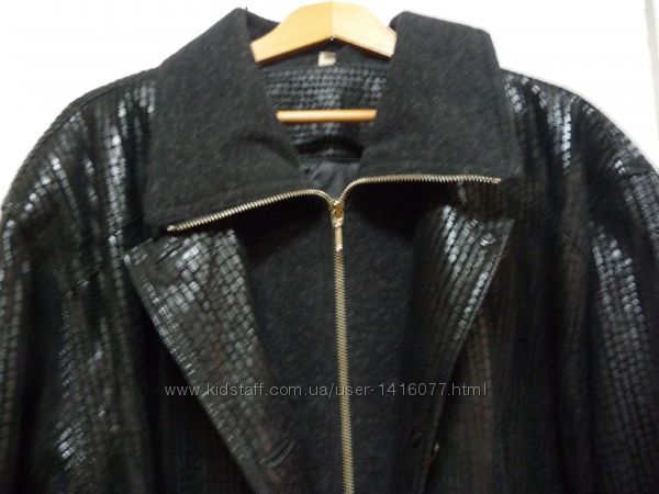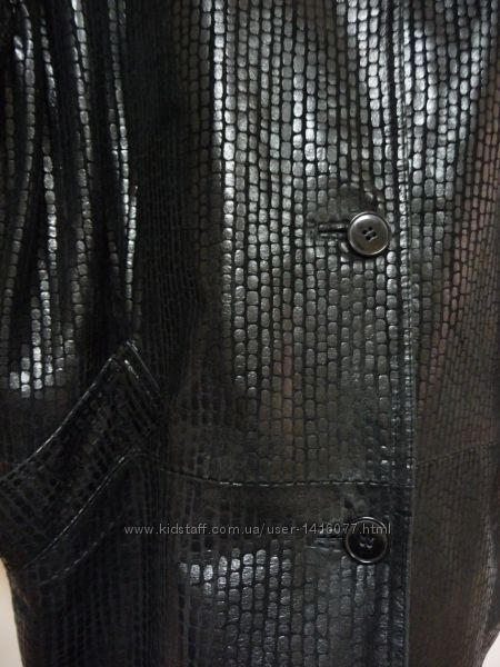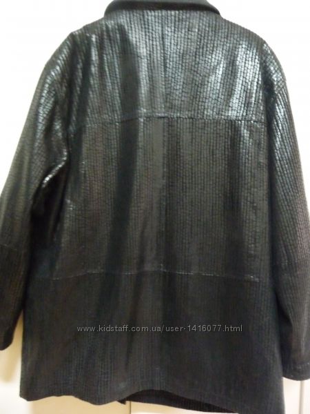Роскошная , фирменная женская куртка большого размера. Цвет черный. Стильный , современный фасон премиум класса. Натуральная лайковая кожа. Верх кожи очень красивый - переливающиеся чешуйки. Воротник и манжеты внутри- шерстяной трикотаж. Подкладка -атласная, отстрочена ромбиками. Утеплитель изософт. Смотрится изыскано нарядно.Длина рукав с отвернутым манжетом-60 см