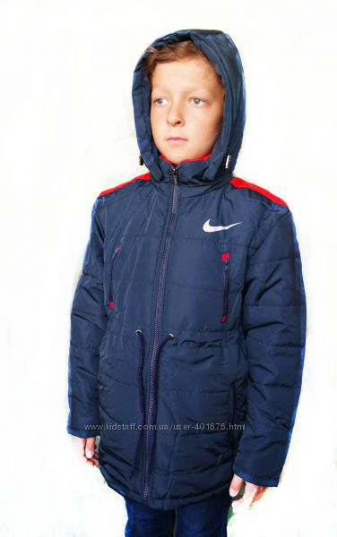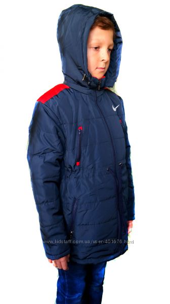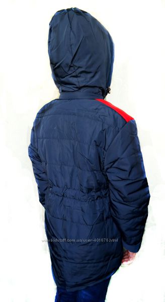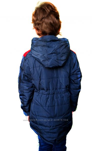 Детская, осенне-весенняя, удлиненная парка на утеплителе, с капюшоном. Капюшон отстегивается. По бокам внизу и вверху прорезные карманы на молнии. Куртка застёгивается на молнию.Цвет синий с красной отделкой Качественный пошив.