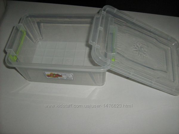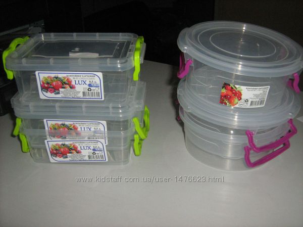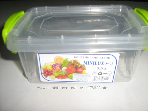 Контейнер призначений для зберігання і перенесення продуктів або готових страв. Комплектується кришкою, яка закривається за допомогою ручок контейнера, перешкоджає випадковому відкриттю кришки. У ручках використовується харчовий барвник, у самому контейнері будь-які барвники відсутні. Зроблено з абсолютно безпечного матеріалу, який може контактувати з їжею, має широкий температурний режим застосування, що дає змогу використовувати його як під час заморожування продуктів, так і під час нагрівання в мікрохвильовій печі. Контейнер може бути використаний як для їжі, так і для зберігання товарів для тварин, побутової хімії та іншого приладдя.- Контейнер 0,5 л - 25 грн.