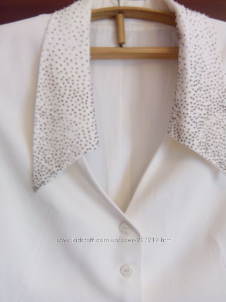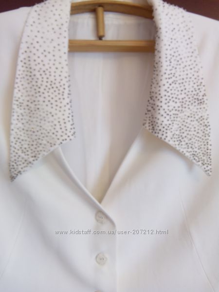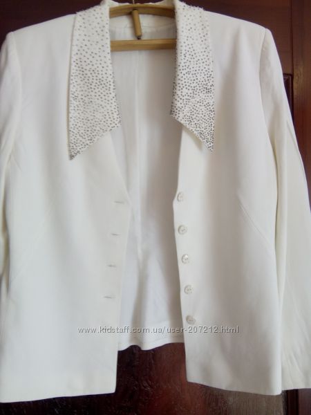 Жакет приталенный женский. Цвет- белый, отделка- вышивка бисером на воротнике и рукавах. Размер 46, с подкладкой.Длина- 60 см,ПОГ- 47 см,,ПОБ- 50 см, длина рукава- 57 см. Подойдет и для торжественных случаев. Красиво и стильно смотрится.Другие объявления продавца