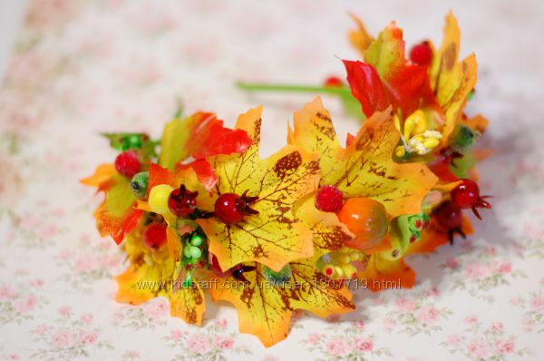 Яркий осенний ободок для волос, в котором собраны все краски осени. Подойдет для тематических мероприятий, концертных выступлений, детского утренника в садике или школе.Все элементы надежно закреплены на тонком металлическом ободке универсального размера.