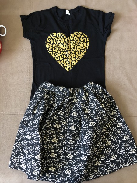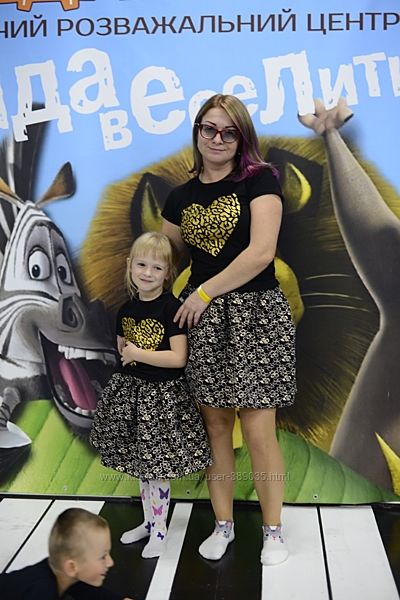 Продам набір спіднички і футболки для мами і дочки в ідеальному стані.Для дорослого: довжина футболки 60 см, в грудях 41(півобхват) тянеться, спідничка: довжина 44, талія 30(півобхват) тянеться. Для донечки, футболка довжина 40, в гудях 31(півобхват), спідничка : довжина 36, талія 23(півобхват) тянеться.