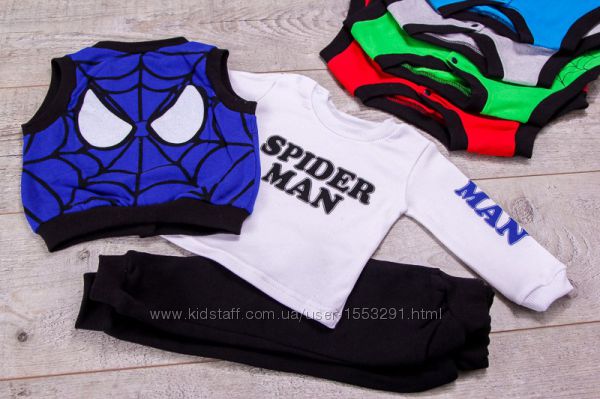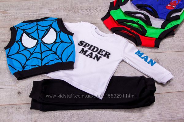 Комплект из натурального полотна – начес. Модель состоит из брючек (чёрные) на резинке с манжетами (начес), кофты (белой) с длинным рукавом (интерлок) и жилетки (начес) - синего цвета(30р, на 2,5-3,5годика). Брюки дополнены карманами, жилетка застегивается на кнопки по всей длине. Изделие украшено оригинальным накатом «СпайдерМен». Вещи из комплекта также можно легко комбинировать с другими вещами малыша — вы всегда сможете создать неповторимый образ для Вашего мальчика. Стирать в вывернутом виде и при температуре не более 30°C, дает усадку на 1-2 см.