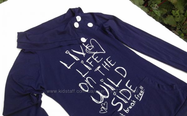 Качественный и стильный свитер, но с нюансом. Брак ткани на кармане и в области бедра - более светлая область ткани - видно на фото.Широкая горловина выполнена в стиле косоворотки на контрастных пуговицах.