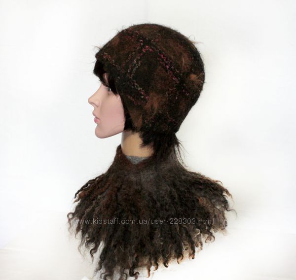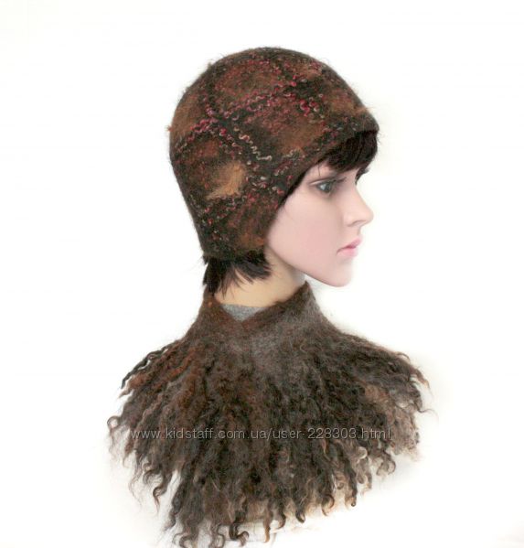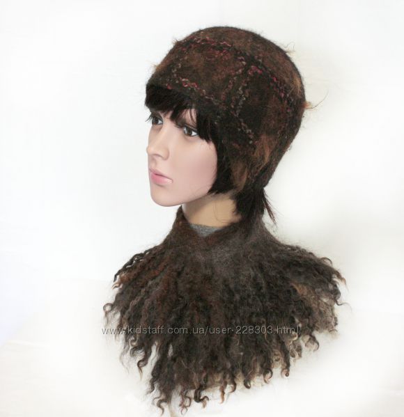 В декоре "принимали участие" : овечья шерсть, шерстяная пряжа, декоративные волокна и изюминка декора - флис альпаки-беби, создающий рыжий пушистый ореол на шапочке.