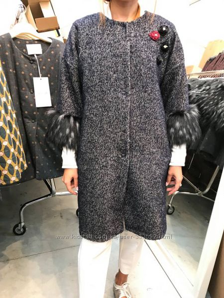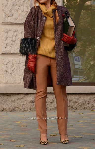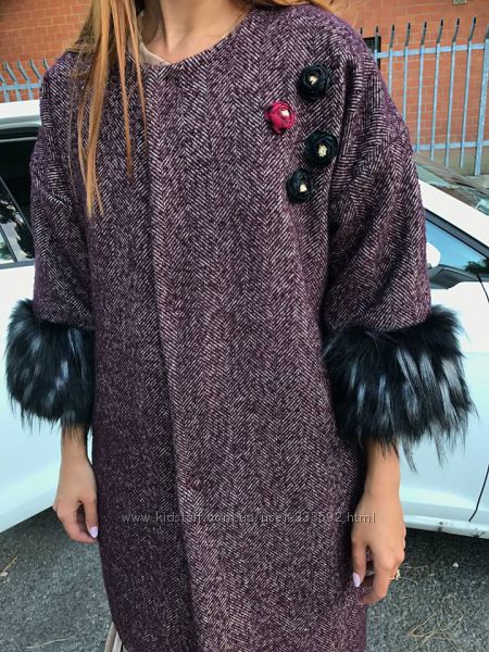 Пальто-кокон с рукавами 3/4. Очень эффектно в нем сочетаются стразу несколько стилей: узор "елочка" вроде бы намекает на классику, но в то же время броши из цветов придают модели некую легкомысленность и романтичность, а рукава, декорированные искусственным мехом, - эпатажность. Вот получается - надевай это пальто хоть с классическими образами на работу, хоть с воздушным платьем на свидание, хоть со скинни или мини - на вечеринку. Цвета : винный