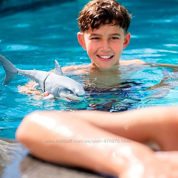 Щоб побачити, на що здатна біла акула, заповни водою велику ванну чи басейн. Бо її довжина становить приблизно 38 см!Просто занур хижака у воду і він почне самостійно пливти завдяки сенсорним датчикам під пащею та водозахисному механізму всередині, який працює на батарейках.Під час переслідування здобичі очі акули світяться яскраво-червоним кольором!Анатомічно рухомий хвіст дає змогу рухатися іграшці максимально реалістично. Проте якщо під час плавання хвіст від’єднається, то його можна легко вставити назад завдяки особливим кріпленням.Акула має режим енергозбереження, який автоматично вмикається приблизно після 4 хвилин. Щоб його деактивувати, вийми її з води на 5 секунд, стряхни залишки води і занур знову.Гладка поверхня зі шрамами та ледь помітним блиском імітує справжню шкіру.Після гри, обов’язково вийми, ретельно стряхни залишки води й висуши рушником.Живлення: 3 батарейки типу ААА (не входять до набору).