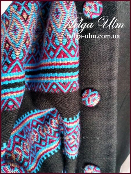 Містичні поєднання холодних та теплих кольорів у орнаменті на чорному тлі, вишиті ґудзички, внутрішні приховані кишеньки яскраво-блакитного кольору. Такого ж кольору атласна підкладка, оздоблена мереживом та окантована по всьому периметру. Для зручності підкладку по низу можна відстібнути від пальта і попрасувати все окремо. Пальто розраховане на тонкий гольф ("водолазку") або ж сукню.