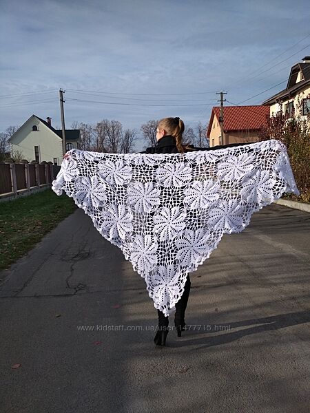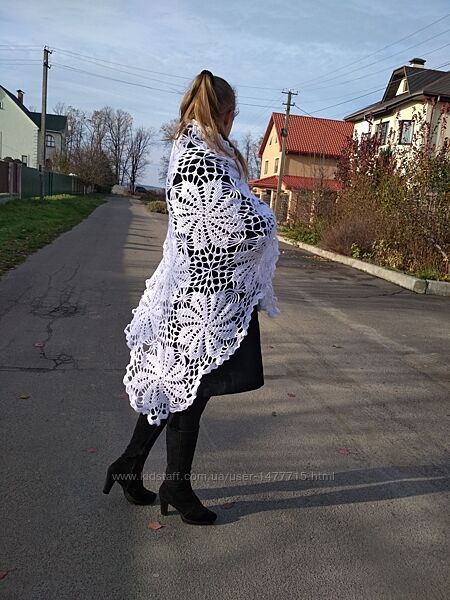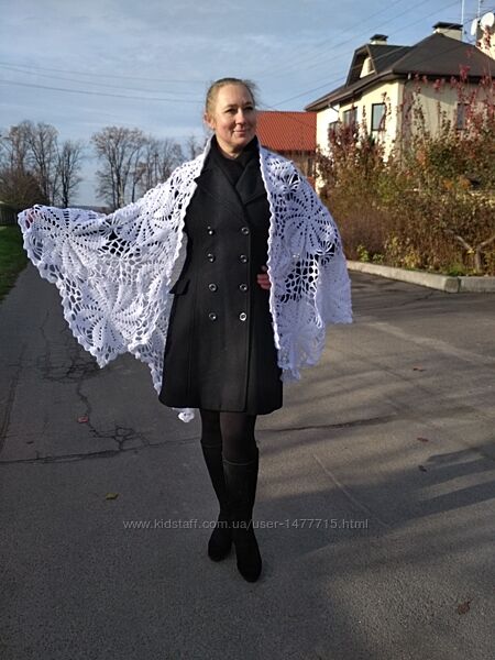 Шаль ручной работы,вязаная крючком.Цвет белый,всегда красиво и нарядно.Мягкая,тёплая,легкая,удобная в носке,хорошо стирается.Отличный подарок к