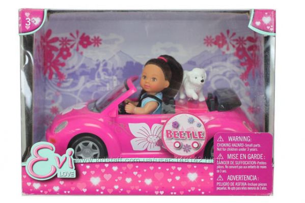 Красивая кукла Evi Love (оригинал) на автомобиле. Вместе с куклой- собачка белого цвета.Evi Love Beettle Doll Playset- Blonde. Высота куклы- около 12 см.