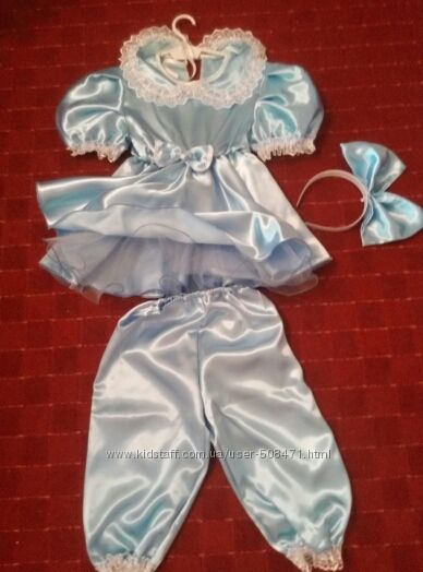 Дитячий костюм для дівчинки «МАЛЬВІНА». Костюм виконаний з атласного матеріалу, сітки та мережива. Складається із сукні з відкладним коміром, штанів-бриджів на гумці з обробкою з мережива, обруча з бантом. Сукня декорована мереживом та бантом на поясі-гумці. Під´юбник із сітки пришитий до пояса. Короткий рукав у формі "ліхтарика" обшитий по мереживному краю.Розмір 116 – 128, підійде на 4-5-6 років. Ціна 350,00 грн. Можливий прокат, ціна прокату 250, 00 грн. Контактний тел. 099-258-0856.