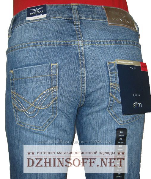 Женские джинсы стандартных размеров. Стильные джинсы MONTANA голубого цвета, так называемой Stone Bleached стирки с отбеливанием. Приятный джинс. Ткань типа "мелкий рубчик". Подойдет для создания молодежного образа. Лаконичная модель, прямой крой,средней посадки. Застёгивается на пуговицу и молнию. Создают привлекательную фигуру. Спереди: полукруглые карманы, справа врезной карман для монет оригинальной формы. В углах карманов фурнитура и косые вытачки. Карманы продублированы строчками контрастного цвета.Сзади: небольние накладные удлиненные карманы оригинальной формы. На карманах строчки контрастного цвета и стразы.