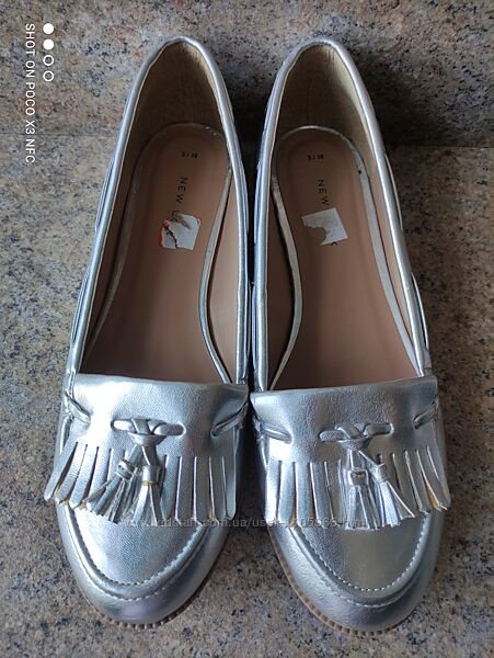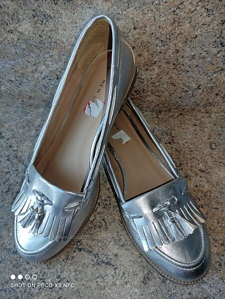 Красивенные туфли лоферы фирмы New Look! Сделаны в Камбодже из искусственной кожи отменного качества! Цвет серебряный. Туфли абсолютно новые, стоковые. Идут без коробки.Размер указан 5, наш 38. Фактическая длина стельки 24,5 см. Ширина стельки в самом широком месте 8 см.