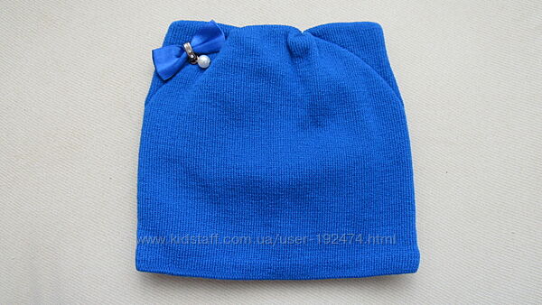 Вязаные акриловые шапочки на флисе с ушками (на ушке бантик и подвеска с жемчужиной) В наличии цвета: бирюза и электрик Полуобхват 22 тянется до 30, глубина 20 Размер универсальный, подойдет девочкам от 5 до 8 лет