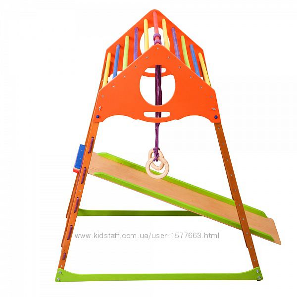 Лёгкий, компактный и многофункциональный спортивный комплекс КиндВуд не требует дополнительной фиксации и прекрасно поместится даже в малогабаритной квартире, а его нейтральная расцветка позволит использовать его как для девочек, так и для мальчиков, и подойдёт для любого интерьера.