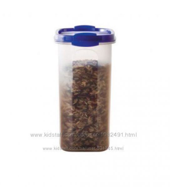 Прозрачная ёмкость предназначена для хранения крупы или муки, крахмала или кофе, какао или сои, соли или сахара, орехов или чая, сухофруктов или сушеных грибов, а также консервированных продуктов или морковки, огурчиков и других продуктов.