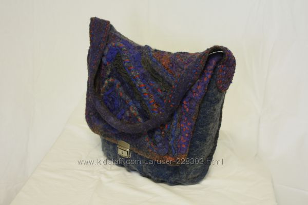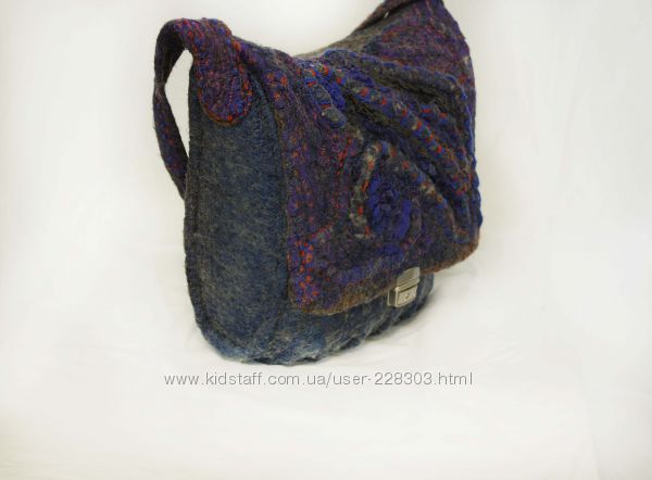 живописная сумка с рифленым дном и клапаном, украшенным декоративными волокнами, шелком, шифоном, кружевом и ручной вышивкой.