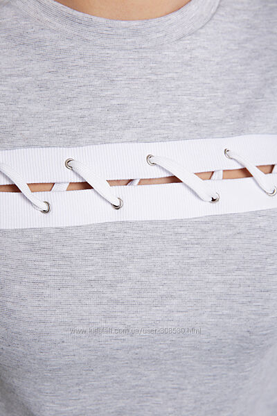Интересная серая кофта. Силуэт изделия полуприлегающий, за счет чего оно прекрасно садится на любой тип фигуры. По низу и на рукавах расположены эластичные манжеты. Вырез горловины округлый. Линия плеча спущена. В верхней части полочки, от одного рукава к другому, горизонтально расположилась вставка из рибаны белого цвета со шнуровкой. Представленная кофта будет стильно смотреться с джинсами, брюками или юбкой.