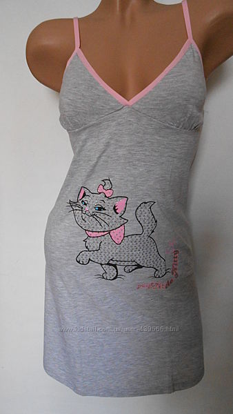Женская ночная сорочка на тонких бретелях. Спереди и сзади чуть длиннее, чем сбоку. Состав: Состав: 70% хлопок, 30% полиэстер. Принт - котята. Турция.