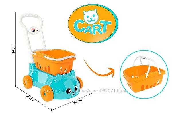 Игрушечная тележка котик. Ее можно использовать в различных сюжетно-ролевых играх магазин, пикник и другие. На тележке надежно закреплена удобная корзина с ручками. Корзиночку можно снять и играть отдельно. В ней удобно переносить фрукты, овощи, посуду, песочные наборы и другие игрушки. Размер корзиночки позволяет брать ее на прогулку, в песочницу или в детский сад.